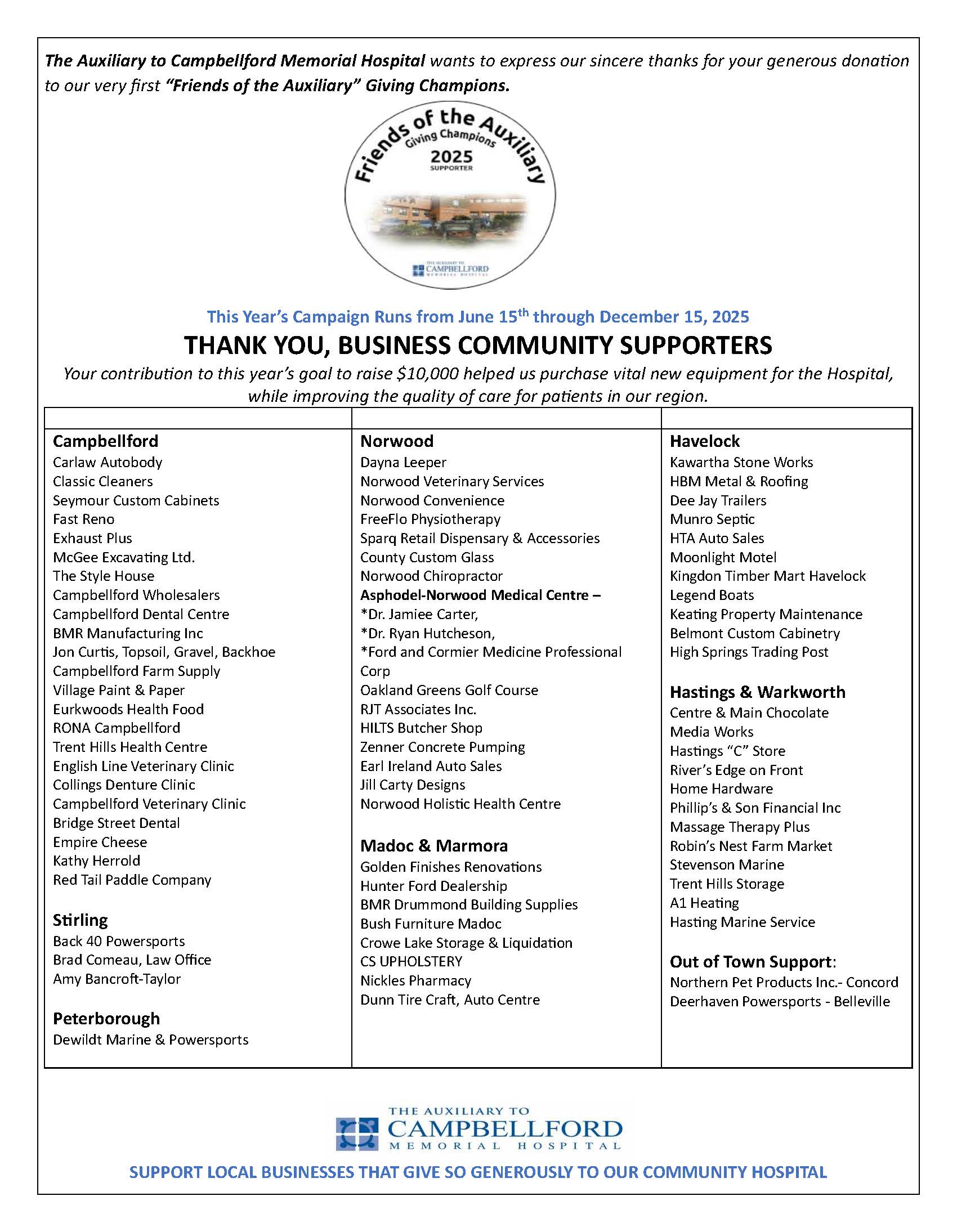 The first annual “Friends of the Auxiliary” Giving Champions campaign invites local businesses to play a vital role in supporting Campbellford Memorial Hospital (CMH). With a fundraising goal of $10,000 for 2025, the Auxiliary will dedicate all proceeds toward purchasing essential new medical equipment, helping to enhance health care services at CMH.