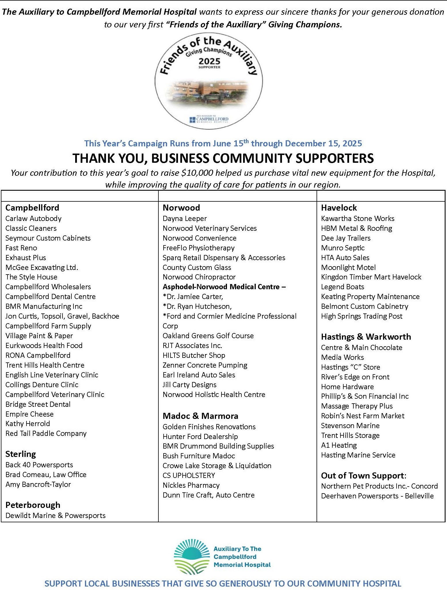 The first annual “Friends of the Auxiliary” Giving Champions campaign invites local businesses to play a vital role in supporting Campbellford Memorial Hospital (CMH). With a fundraising goal of $10,000 for 2025, the Auxiliary will dedicate all proceeds toward purchasing essential new medical equipment, helping to enhance health care services at CMH.