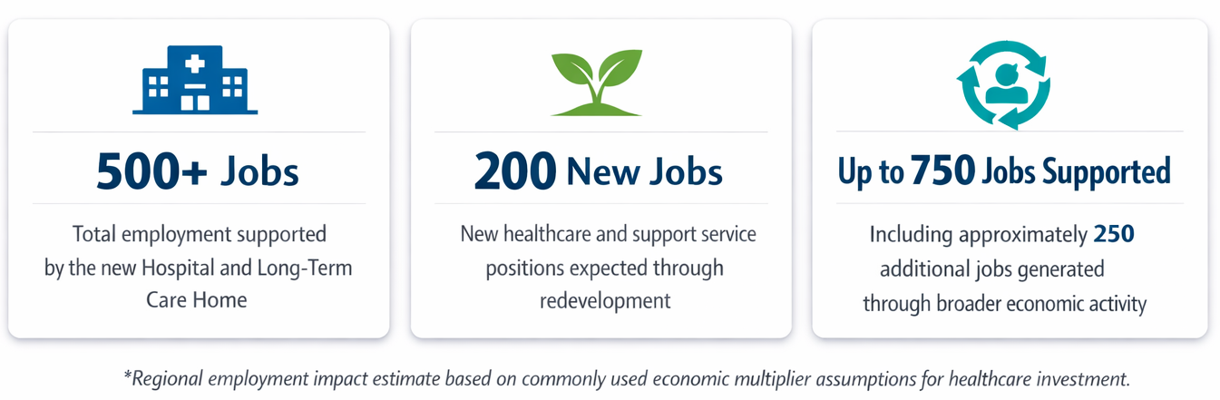 Research shows rural healthcare job multipliers typically range between 1.1 and 1.7 total jobs supported for every direct job created. Using this moderate and widely accepted planning assumption, 500 direct jobs could support the equivalent of approximately 250 addtional jobs across the region leading to a total of 750 jobs throughout the region supported by our new Campus of Care.